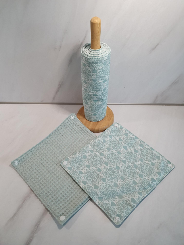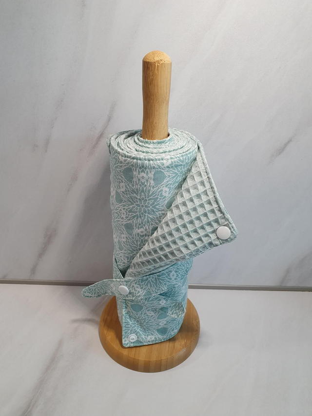 Essuie-tout lavable. Composé de 8 "feuilles" avec attaches pressions et de son support (possibilité de vente sans support, n'hésitez pas à me contacter).