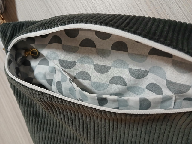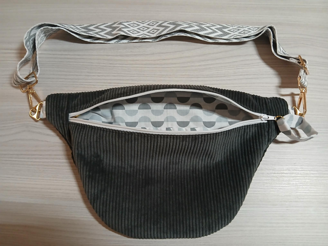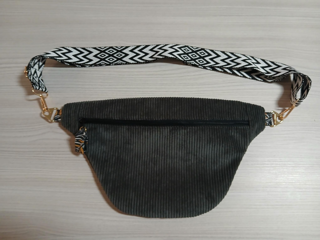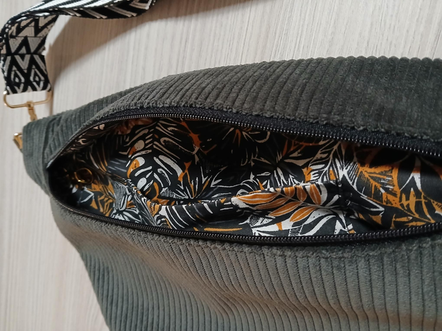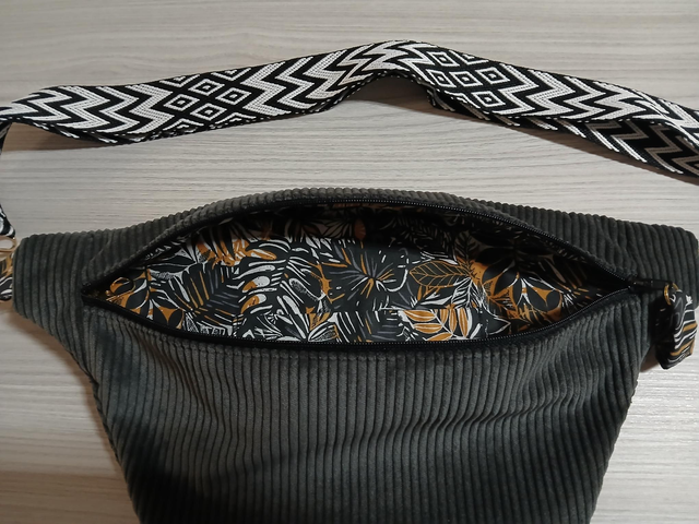 Sac banane en velours côtelé extérieur et intérieur coton à motifs. Les motifs se retrouve également au niveau des attaches et de la fermeture.