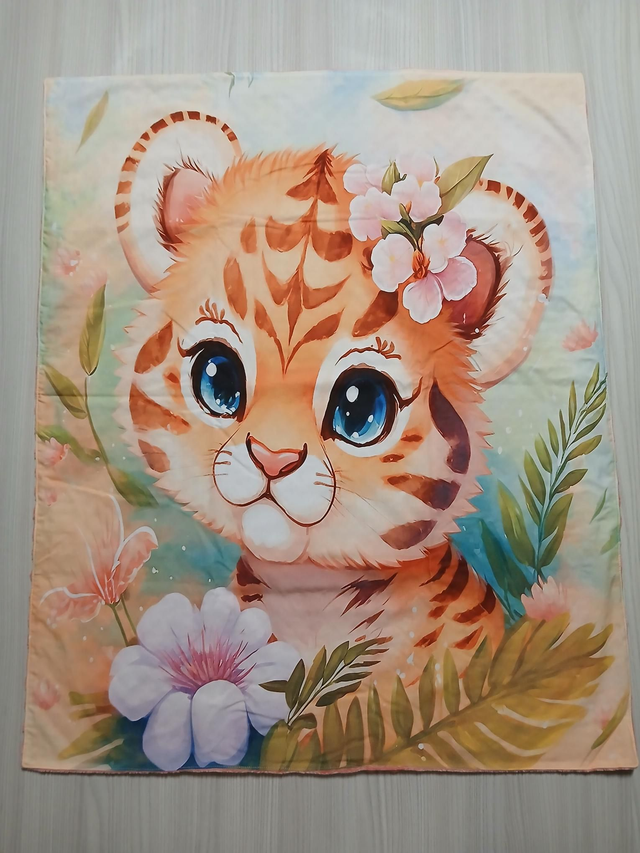 Tissu coton motif tigre fleuri d'un côté et tissu minky rose tout doux de l'autre côté.